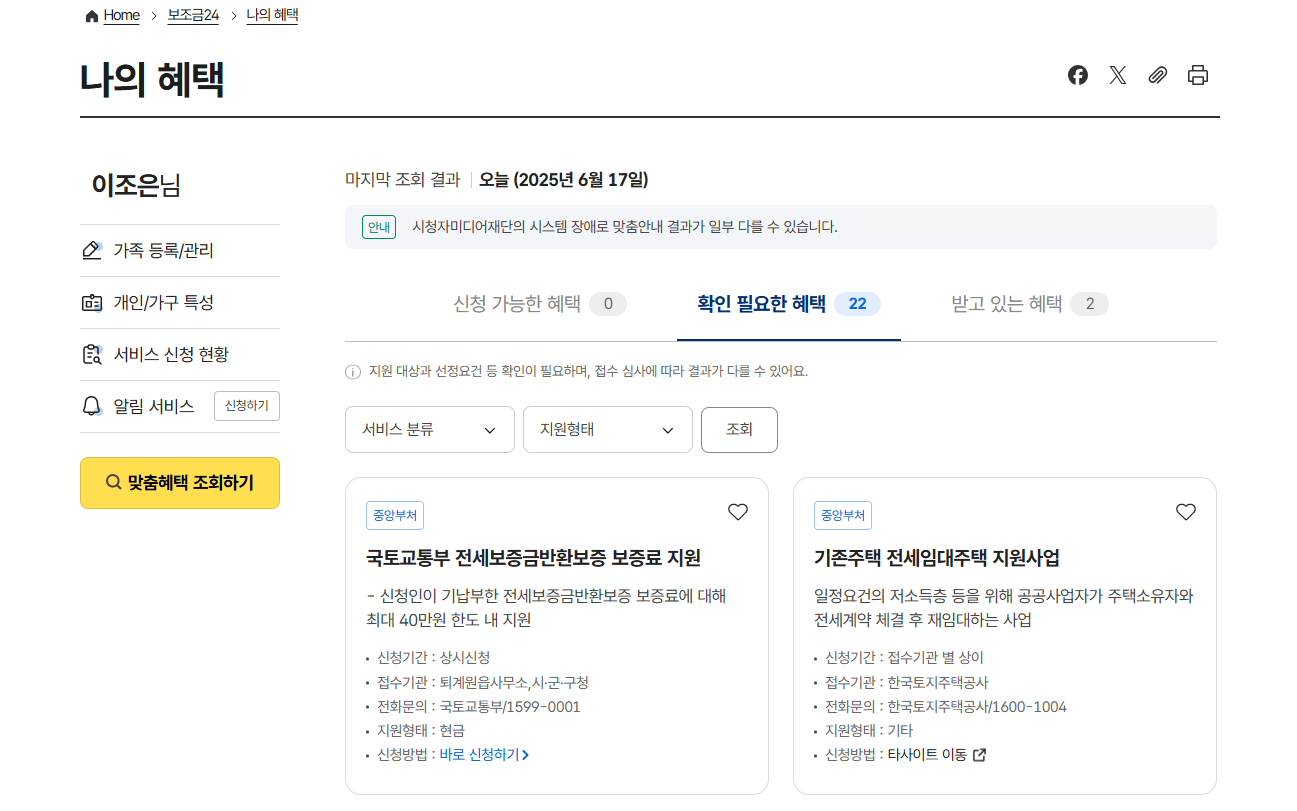 만약 현재 나와 관련된 정보가 충분하지 않다고 판단된다면, 내 정보 수정 메뉴를 통해 소득, 재산, 가구원 정보 등을 추가로 입력할 수 있습니다. 자녀 유무, 장애인 여부, 주택 소유 여부 등 구체적인 정보를 추가하면, 시스템이 더욱 정교하게 나에게 맞는 지원금을 찾아줄 수 있습니다.