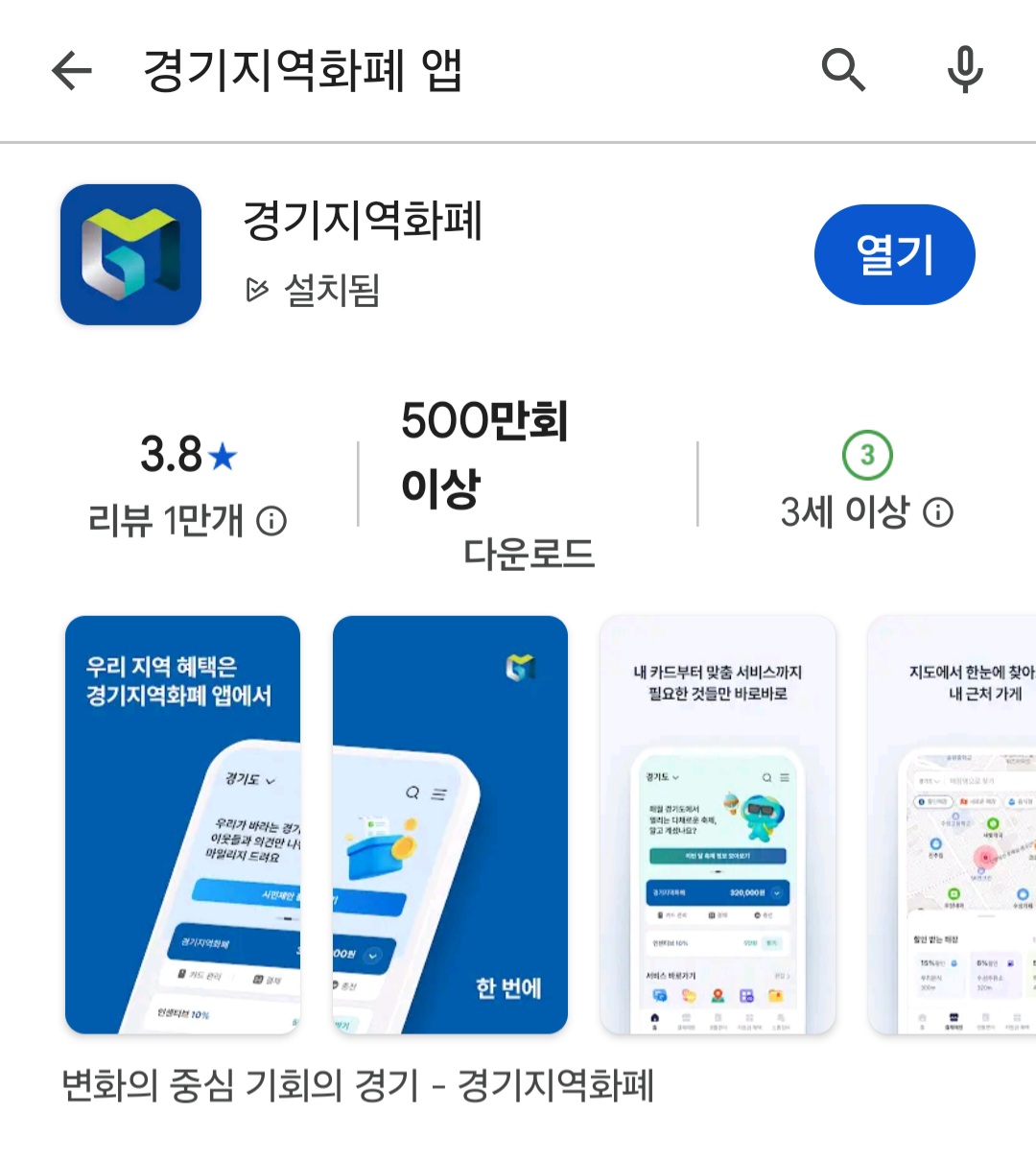 - 앱 다운로드 : 가장 먼저 스마트폰의 앱스토어(아이폰) 또는 플레이스토어(안드로이드)에서 경기지역화폐 앱을 검색하여 설치합니다.