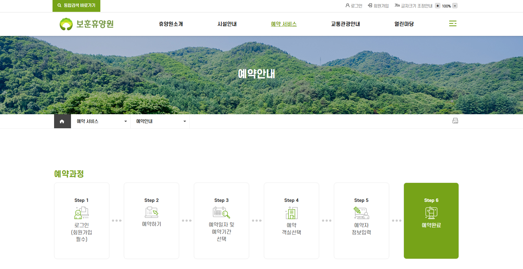홈페이지 기반 예약은 전산 추첨제 접수 및 잔여 객실 선착순 예약 모두 동일한 절차를 따릅니다.