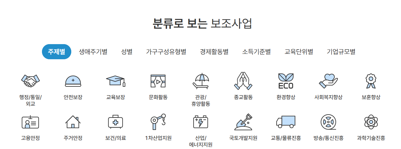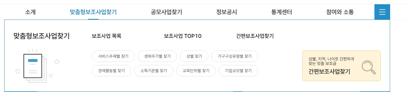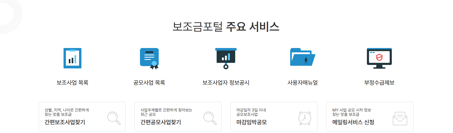 홈페이지 메인 화면에 있는 보조금 찾기 메뉴를 이용하면, 현재 진행 중인 다양한 보조금 사업을 한눈에 볼 수 있습니다. 사업명, 부처, 지자체 등 다양한 검색 필터를 활용하여 검색 범위를 좁힐 수 있습니다.