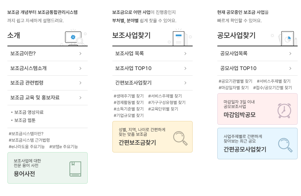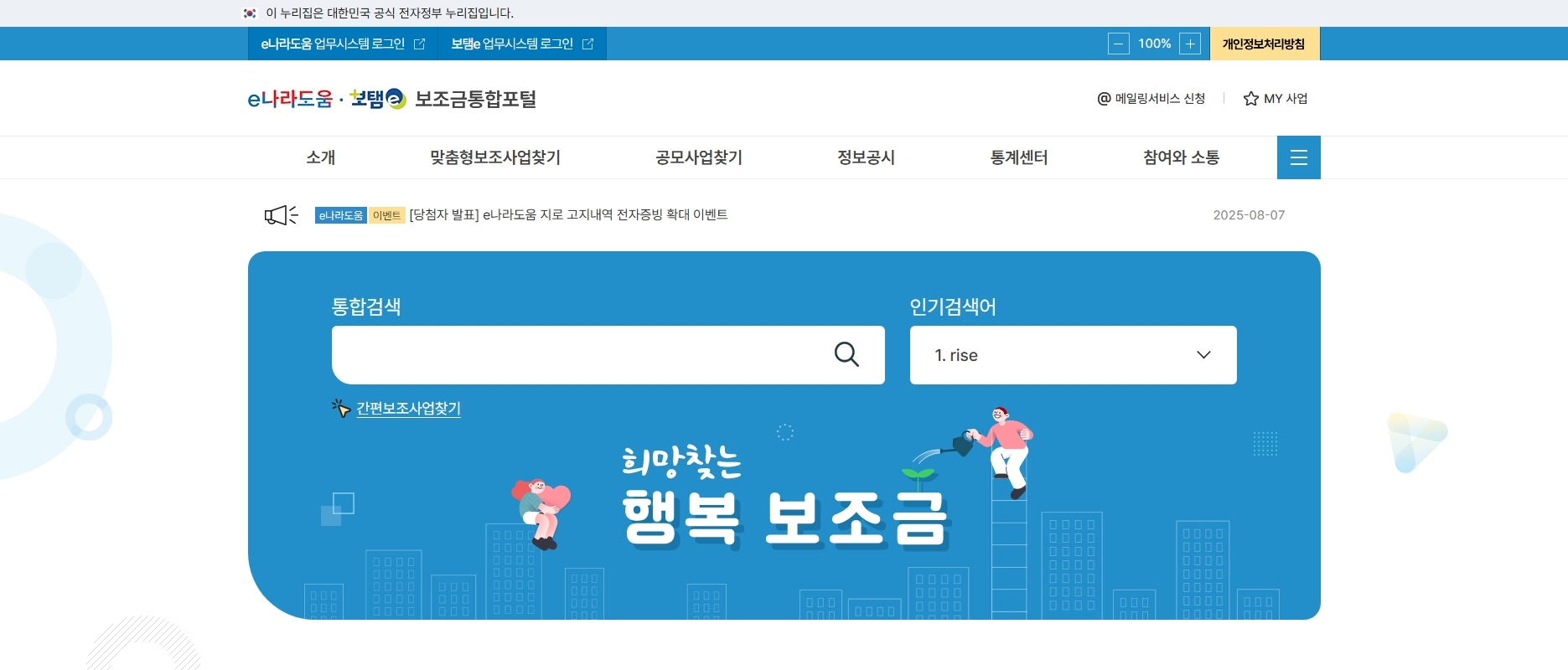 e나라도움 홈페이지에서는 방대한 보조금 사업 정보 속에서 자신에게 필요한 정보를 효율적으로 찾아볼 수 있습니다.