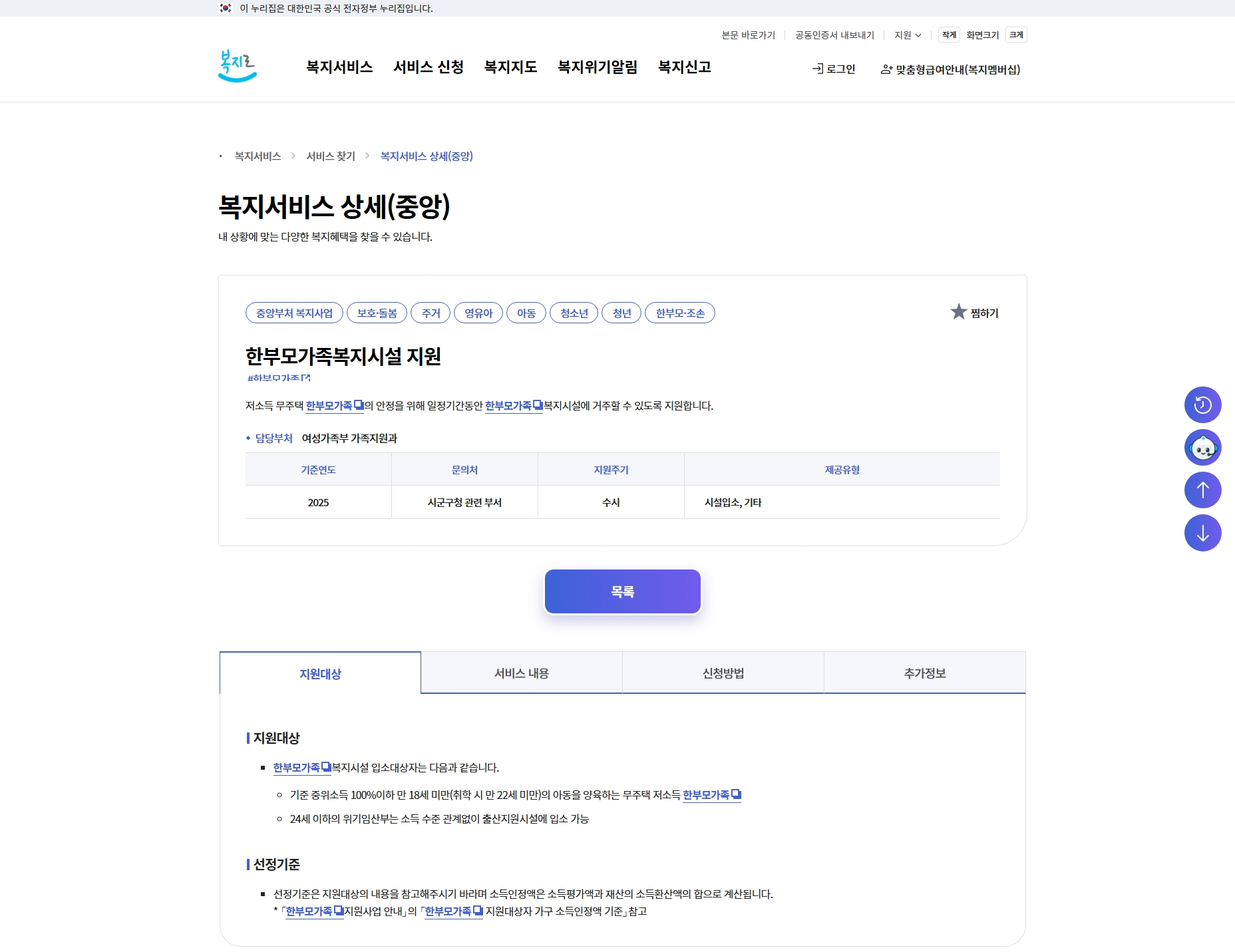 2025년 기준으로, 한부모가족은 가구의 소득인정액이 기준 중위소득 63% 이하여야 지원 대상이 됩니다. 여기서 기준 중위소득은 매년 보건복지부 장관이 고시하는 금액으로, 전체 가구의 소득을 순서대로 나열했을 때 가장 중간에 있는 가구의 소득을 뜻합니다.