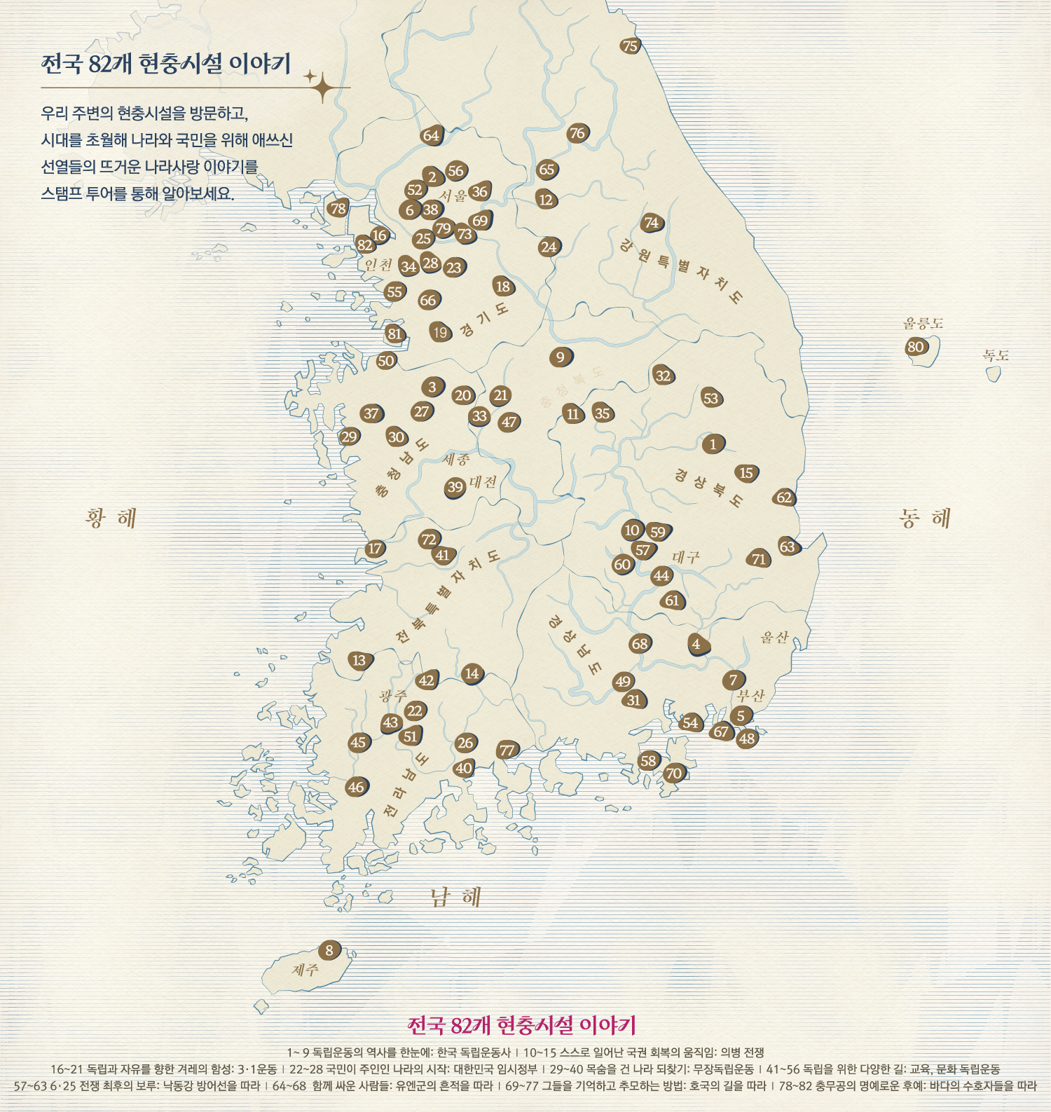 스탬프를 하나씩 모을 때마다 여러분의 마음속에 자긍심과 감사함이 깊이 새겨질 것입니다. 투어가 끝난 후에는 손에 쥐게 될 기념품뿐만 아니라, 가슴속에 영원히 남을 소중한 추억과 의미를 얻게 될 것입니다.
