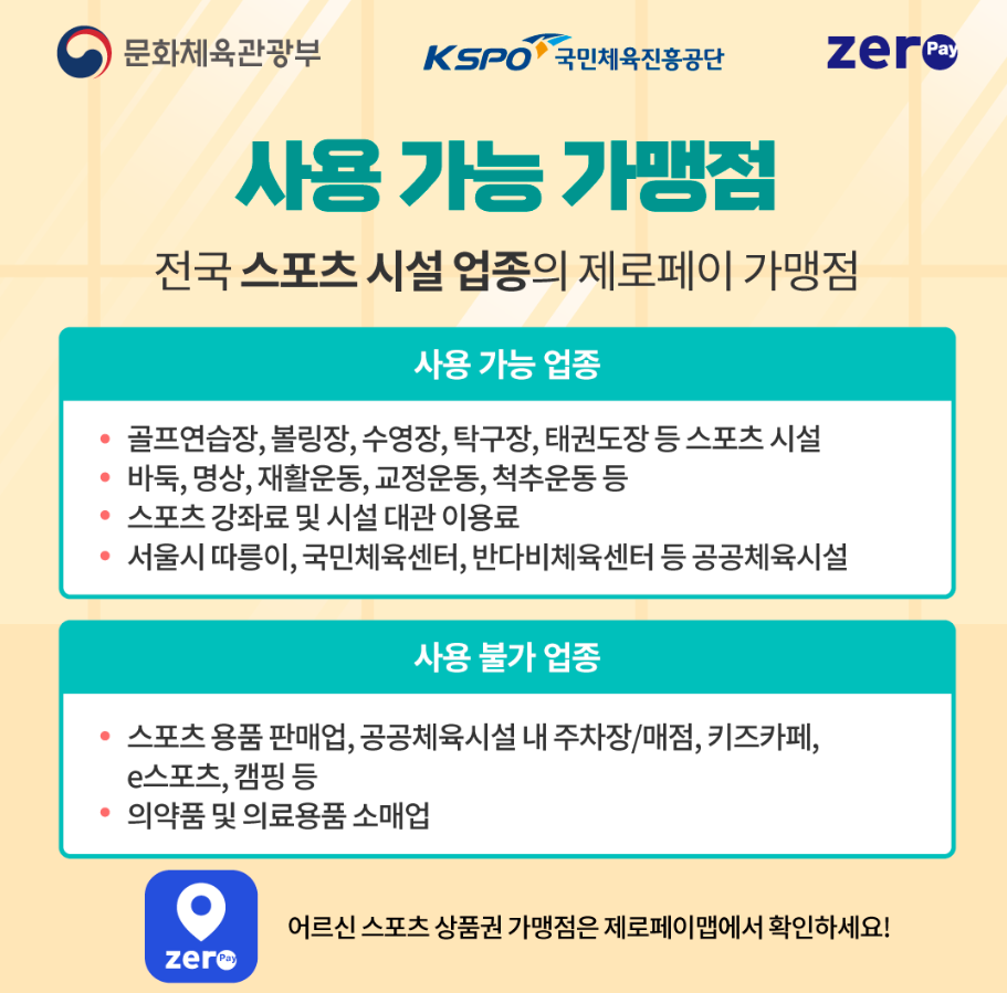 사용처는 국민체육진흥공단 홈페이지나 상품권에 안내된 QR코드를 통해 확인할 수 있으며, 주로 아래와 같은 시설에서 사용 가능합니다.