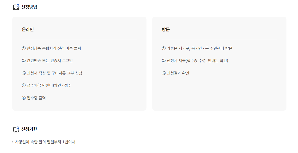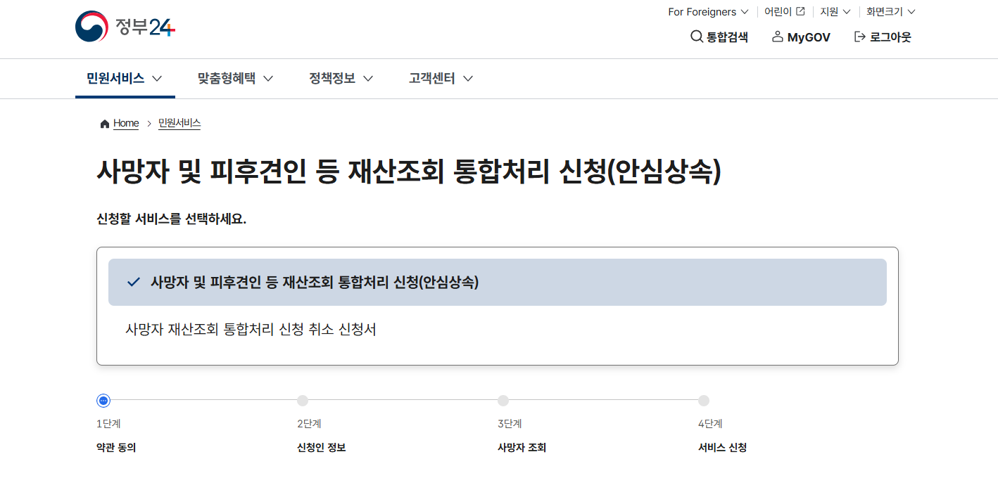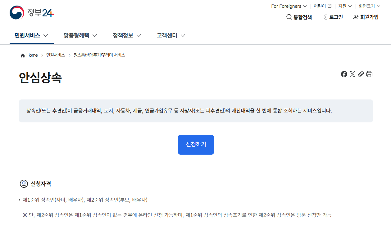 이 서비스는 한 번의 신청으로 사망자의 금융 거래 내역, 토지, 자동차, 세금 등 상속 관련 재산 정보를 한 번에 조회할 수 있게 해주는 매우 유용한 제도입니다.