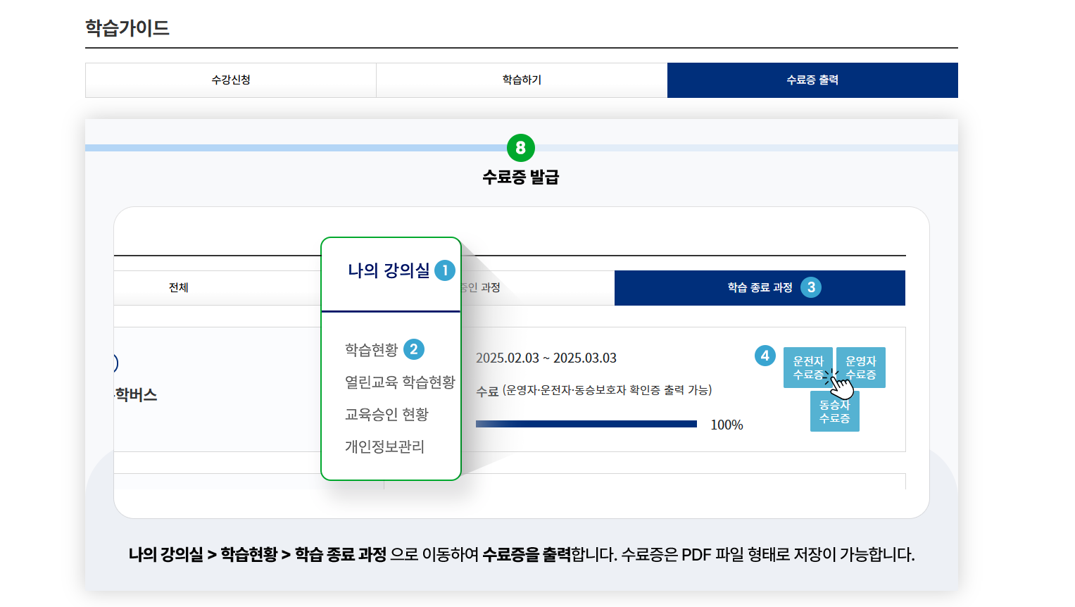 모든 강의를 이수하고 120분의 교육 시간을 모두 채우면 자동으로 이수 처리가 됩니다. 별도의 시험은 없으며, 교육 이수 정보는 운전면허 갱신 기관으로 자동으로 전송됩니다. 이수 여부는 도로교통공단 안전운전 통합민원 사이트 마이페이지에서 확인할 수 있습니다.