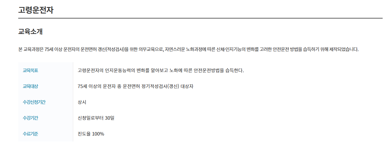 고령운전자 온라인 교육은 총 2시간(120분) 분량의 동영상 강의로 구성되어 있습니다. 강의 내용은 크게 세 가지로 나뉩니다.
