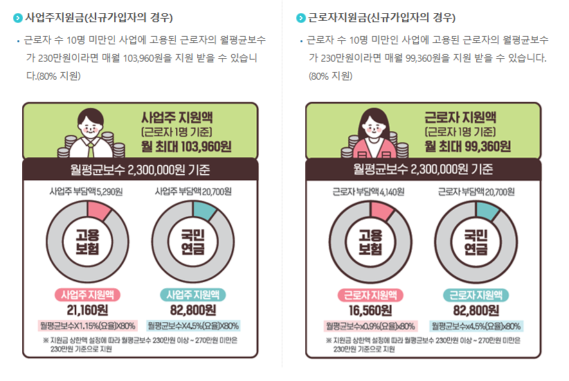 5인 미만 사업장의 월평균 보수 100만 원인 근로자의 경우, 사업주와 근로자가 각각 내야 할 보장료의 80%를 지원받습니다. 지원금액은 국민연금과 고용보장료를 합산해 계산됩니다. 지원금이 적용되면 사업주와 근로자 모두 부담하는 보료가 크게 줄어듭니다. 또한, 이 지원금은 신규 가입자뿐만 아니라 기존 근로자 중 지원 조건에 부합하는 근로자에게도 적용될 수 있습니다.
