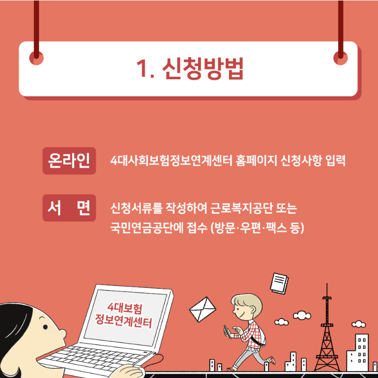직접 방문하거나 우편 또는 팩스로 신청할 수 있습니다. 신청서를 작성하여 사업장 관할 국민연금공단 지사 또는 근로복지공단 지사로 보내면 됩니다.