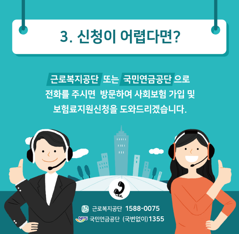 국민연금공단 콜센터(1355)나 근로복지공단 콜센터(1588-0075)에 전화하여 사업장 정보와 근로자 정보를 알려주면 지원 대상 여부를 바로 확인할 수 있습니다.