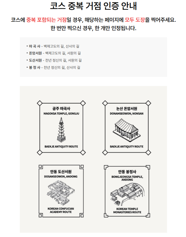 코스에 중복 포함되는 거점일 경우, 해당하는 페이지에 모두 도장을 찍어야합니다. 한 번만 찍으신 경우, 한개만 인정됩니다.