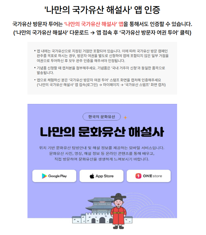 이 인증서는 단순한 종이 한 장이 아니라, 우리 국가유산을 사랑하고 아끼는 마음을 인정받는 의미 있는 증표입니다. 또한, 시기마다 달라지는 기념품은 여정의 노력을 보상하는 특별한 선물로, 여행의 마지막을 더욱 풍성하게 만들어 줍니다.