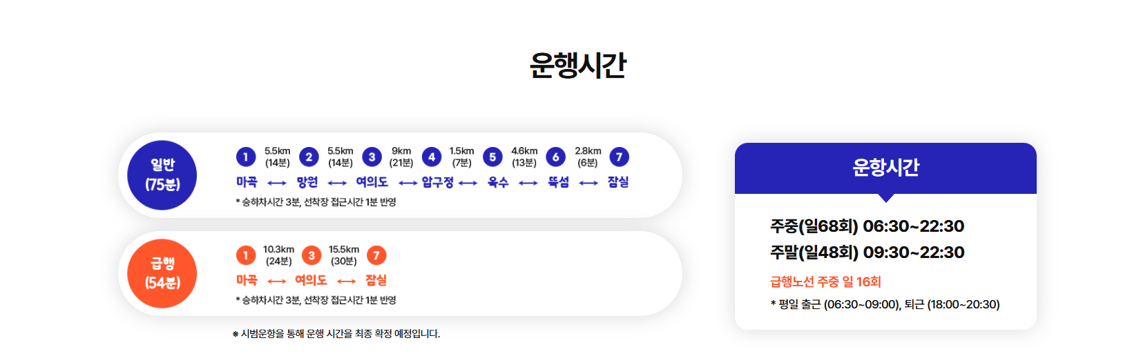 평일 출퇴근 시간대에만 운행되며, 마곡 · 여의도 · 잠실 3개 선착장에만 정차하여 이동 시간을 단축합니다.