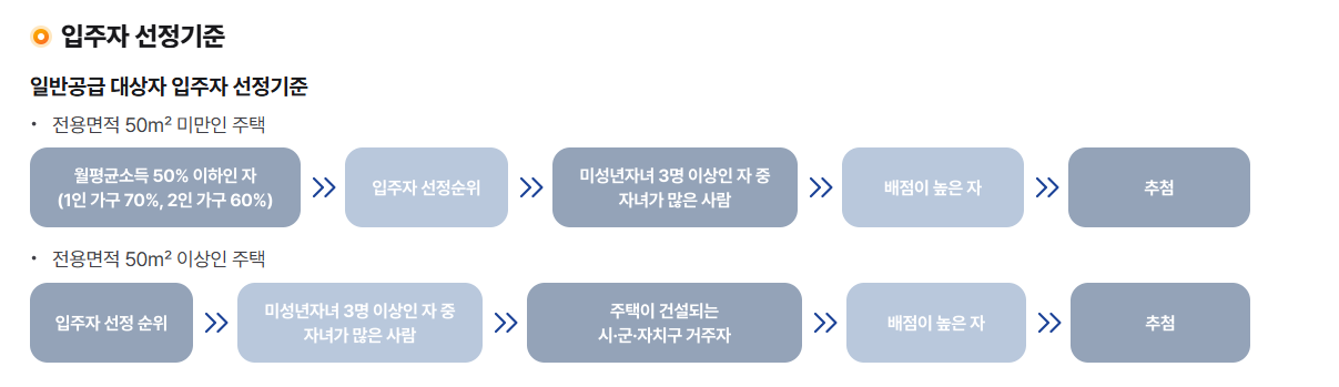 순위가 동일한 경우, 세대원 수, 주거 취약 계층 여부, 주택저축 납입 횟수, 해당 지역 거주 기간 등에 따라 추가 배점을 받아 최종적으로 입주자가 선정됩니다. 자녀가 3명 이상인 다자녀 가구나 장애인 등에게는 추가 점수가 부여됩니다.