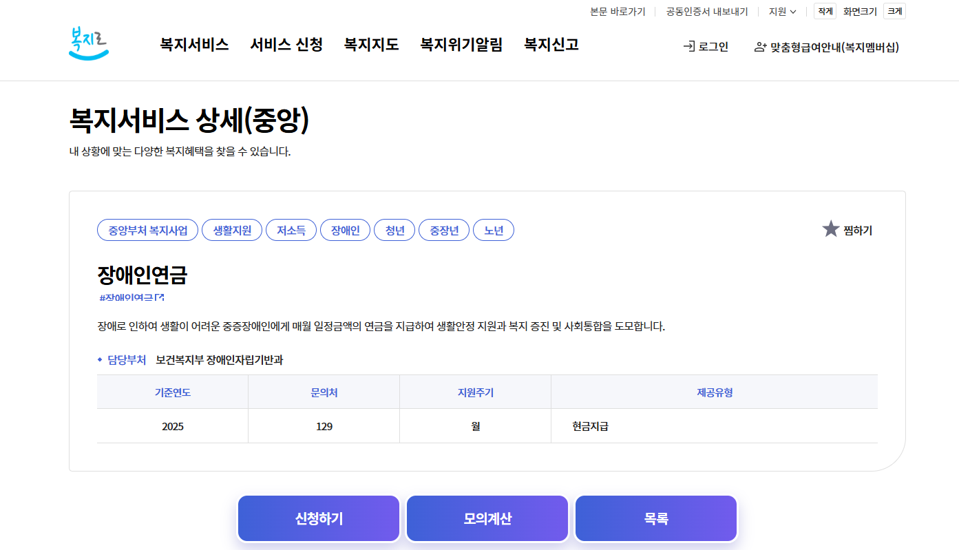 복지로 홈페이지 접속 후 서비스 신청 메뉴에서 장애인 연금 을 선택합니다.