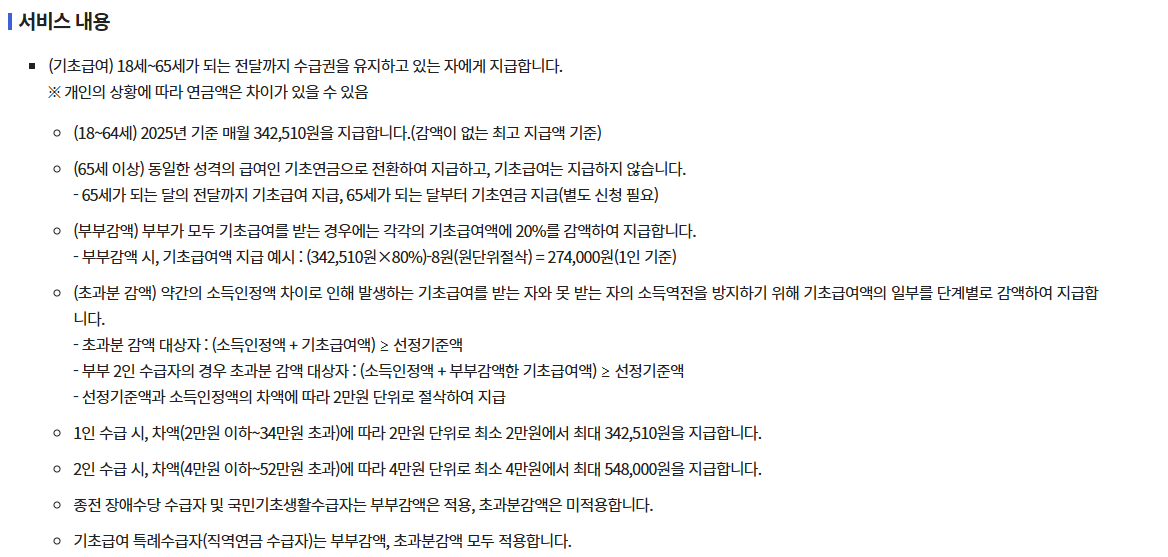 기초급여는 중증장애인의 안정적인 생활을 지원하기 위한 기본적인 급여입니다. 금액은 2025년 기준, 월 최대 43만 2,510원입니다. 이 금액은 매년 물가 상승률 등을 고려하여 변동될 수 있습니다.