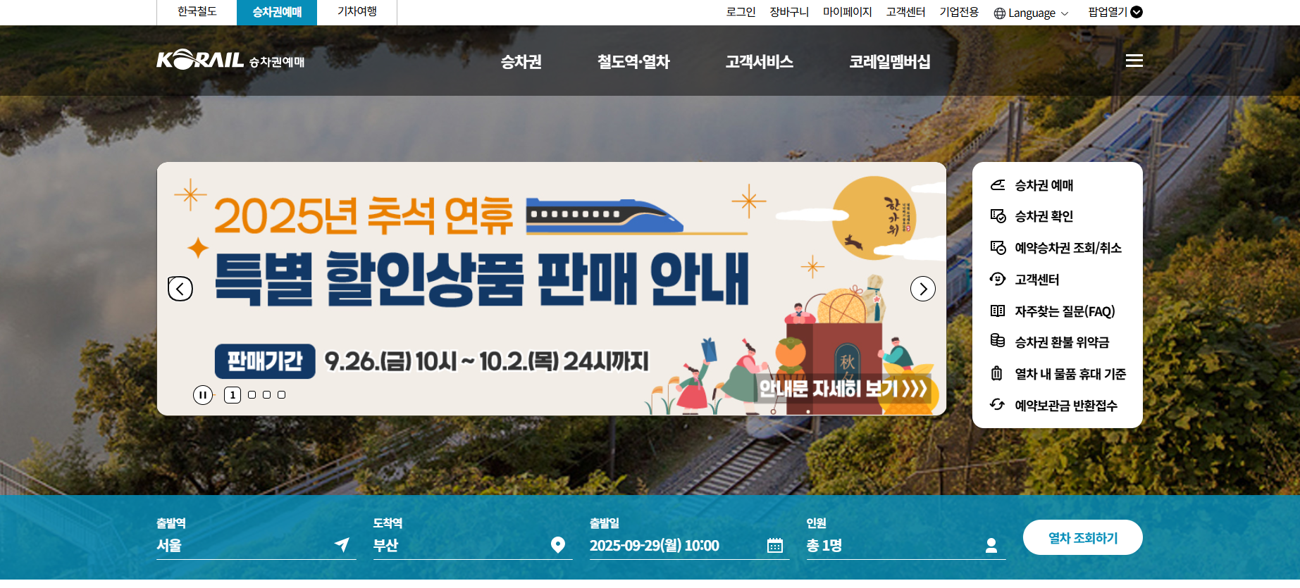 메인 화면에서 승차권 예매를 선택하고 서울과 부산을 지정한 후, 원하는 날짜와 시간을 지정합니다.