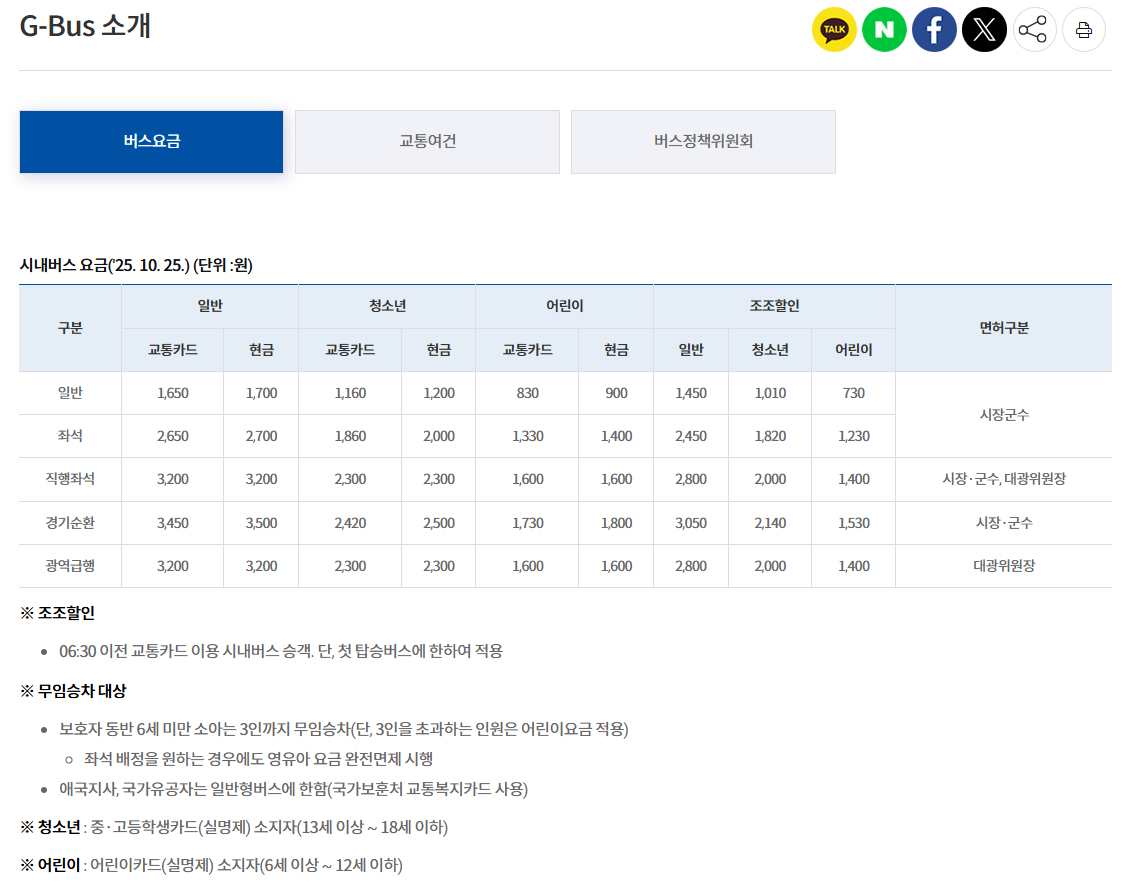 ■ 최신 경기도 버스 요금표 (2025년 10월 25일 첫차 기준, 교통card 기준)