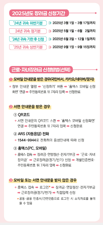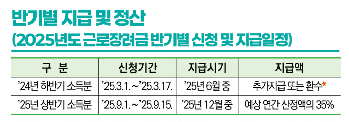연 1회 지급되는 정기 신청보다 소득 발생 시점에 맞춰 장려금을 미리 받을 수 있어 가계 운영에 도움이 됩니다. 상반기 신청 시 하반기 신청을 한 것으로 간주하여 별도의 신청이 필요 없습니다.