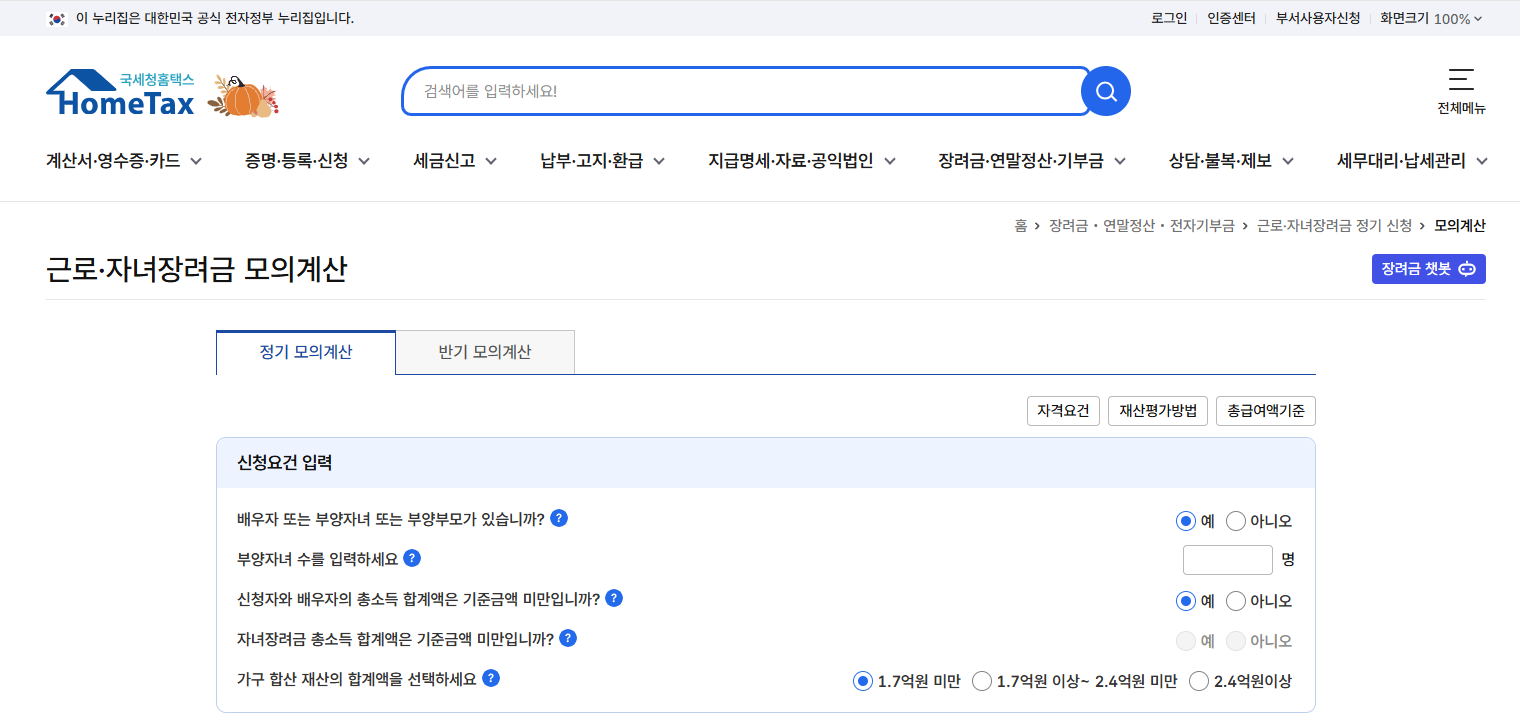 모의계산 페이지에서 본인의 소득(총급여액 등)과 재산 합계액 등 필수 정보를 정확하게 입력합니다.